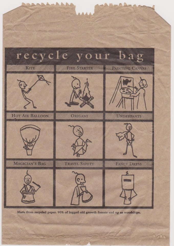 I love this – my purchase from a shop in Hobart, Tasmania, came packed in a paper bag complete with inspiration. Why just throw it away when you can do all sorts of crazy stuff instead?